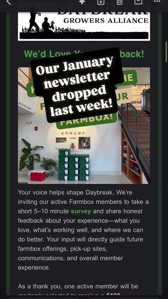 “I just wanted to let you know how happy we are with the service and the quality of goods we receive each week. Our Daybreak farm box pick-up is quickly becoming the highlight of my week!”