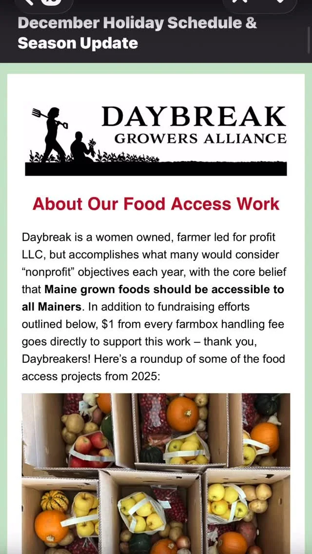 Get a glimpse into the work that happens year-round at Daybreak Growers Alliance—from winter crop planning to summer harvests—to bringing fresh, local food to pickup sites in your community. You’ll see how your support fuels over 100 Maine farms and food businesses, strengthens our local food system, and helps make good food accessible across the state.
