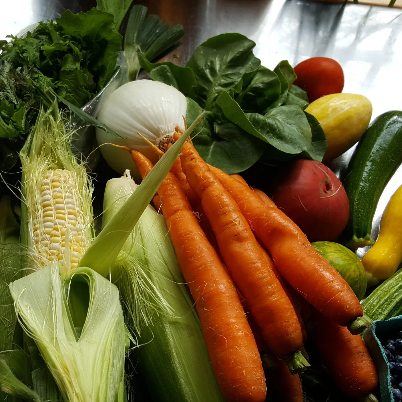 Salad Mix, Lettuce Heads, Kale, Chard, Mustards, Collards, Beets, Carrots, Salad Turnip, Celery, Cauliflower, Broccoli, Snap Beans, , Scallions, Onions, Garlic, Tomatoes, New Potatoes, Peppers, Eggplant, Zucchini & Summer Squash, Cucumbers, Sweet Corn, Cantaloupe, Watermelon, Blueberries